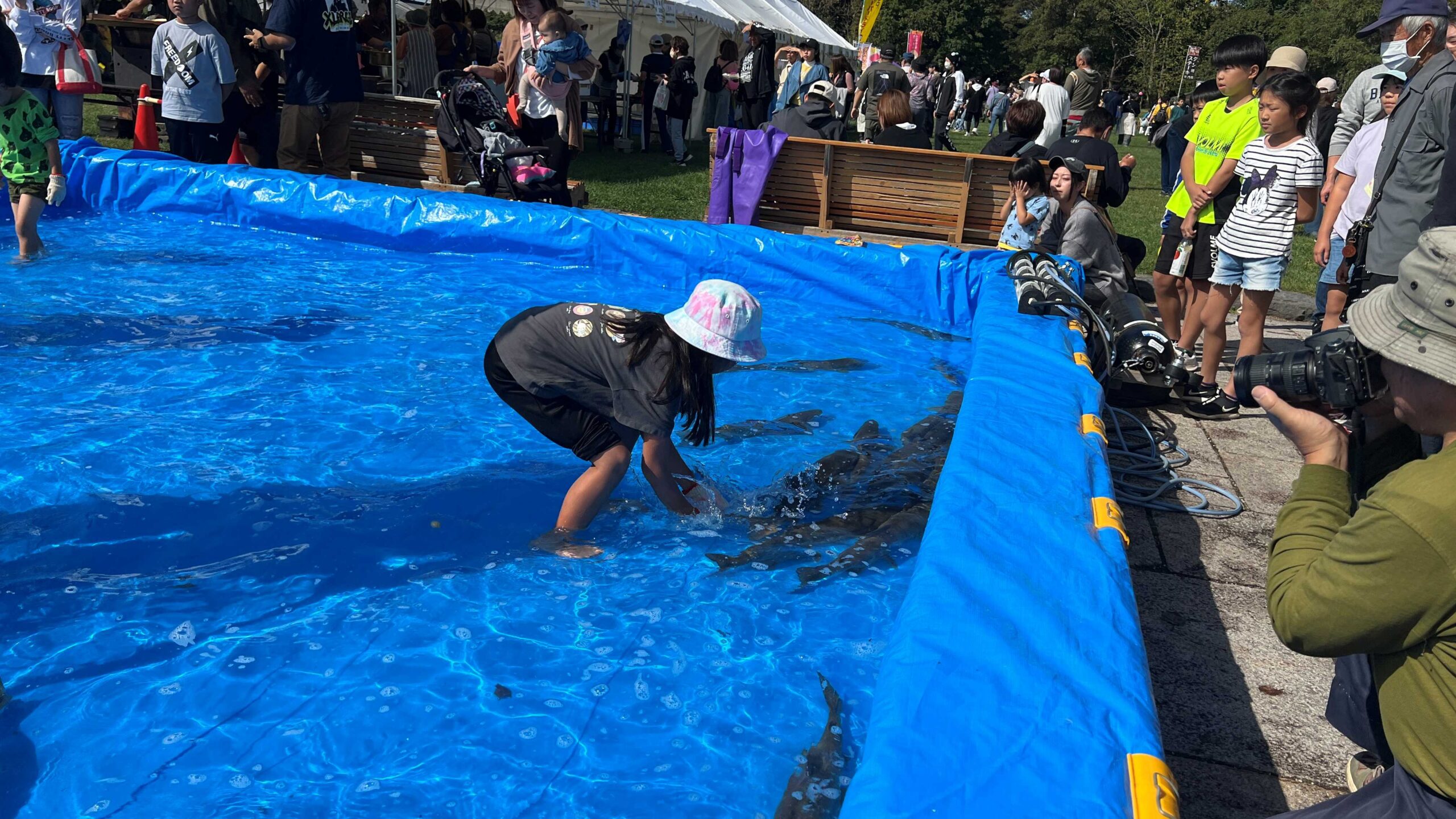 プールの中を泳ぐ秋鮭をゲットしよう!