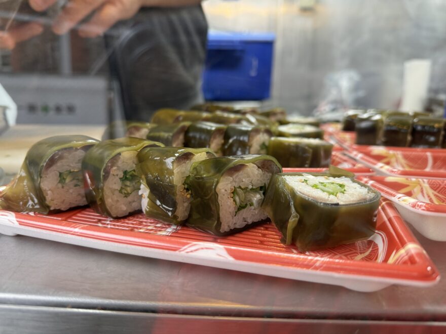 さんまといわしを棹前(さおまえ)昆布で贅沢に巻いたロール寿司。