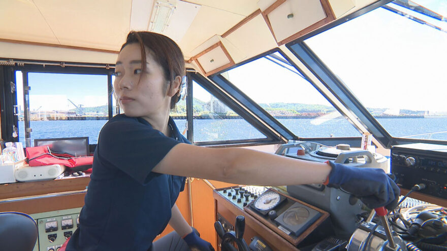 観光船で白鳥大橋に向かいます。舵を握るのは伊藤船長。